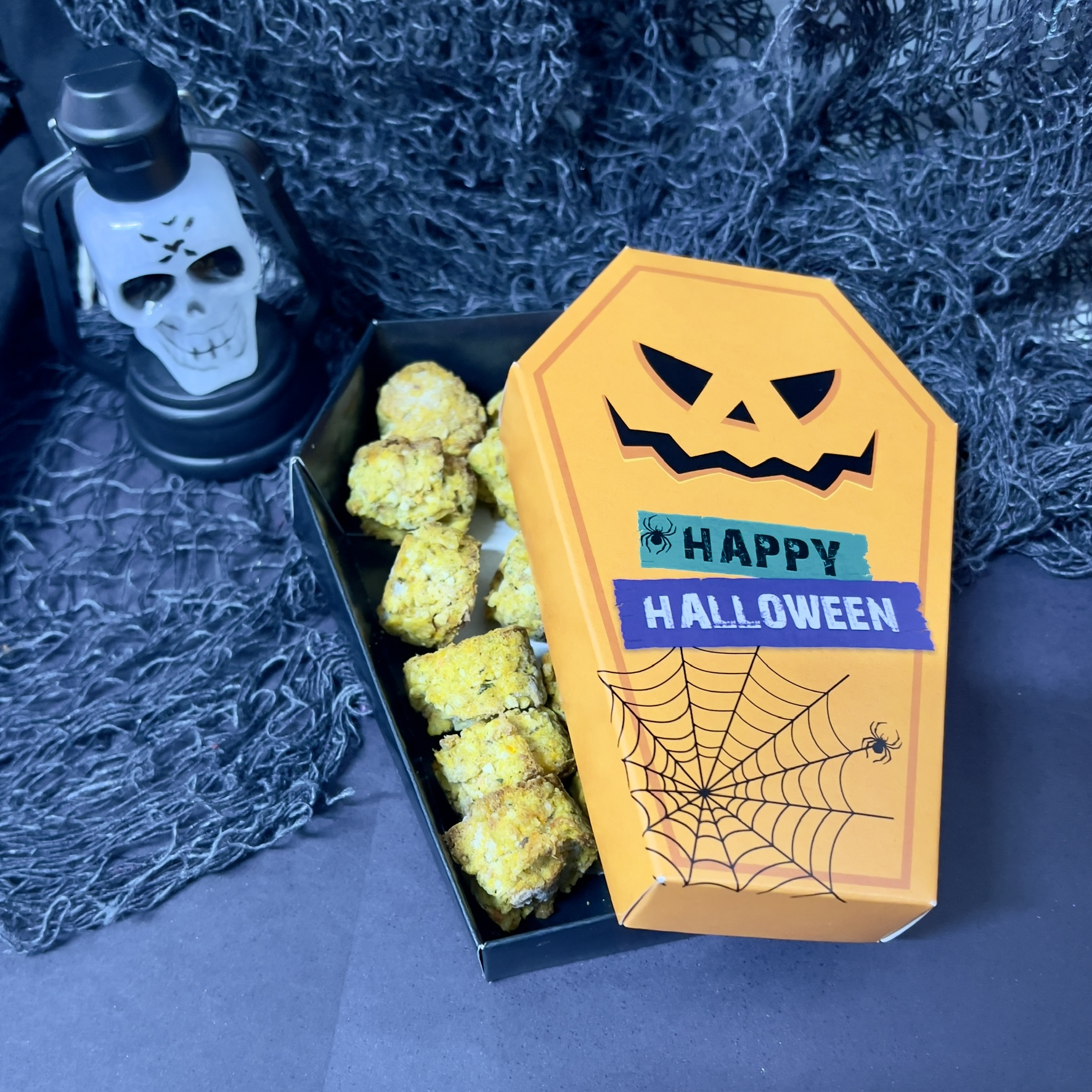 Os mini cookies têm o formato de abóboras com caretas, perfeitos para entrar no clima do Halloween. Seu pet vai adorar mordiscar essas pequenas abóboras do terror, enquanto você se diverte vendo sua carinha fofa de surpresa!