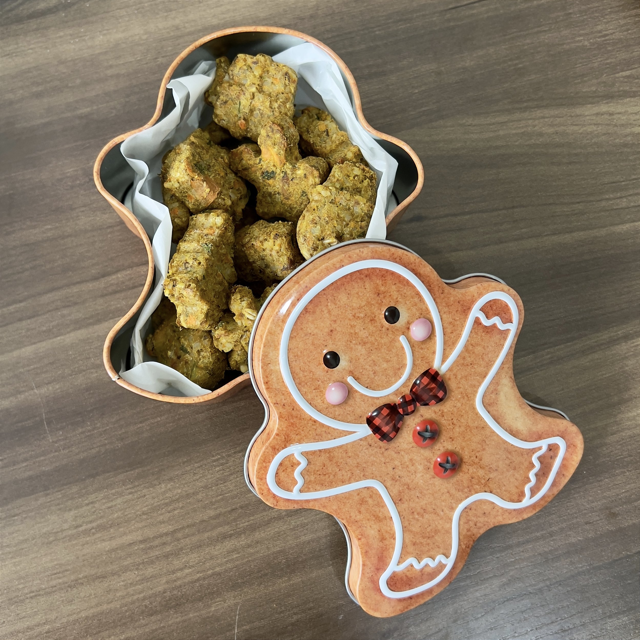 A Lata Encantada ObentōPet é uma explosão de fofura em forma de Papai Noel ou Gingerbread Man, recheada com 150 gramas dos adoráveis minicookies comemorativos. 🐶💕